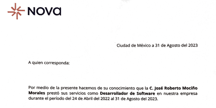 Ingeniería Aplicada Nova, S.A. de C.V - Desarrollador de Software - 1 año 5 meses